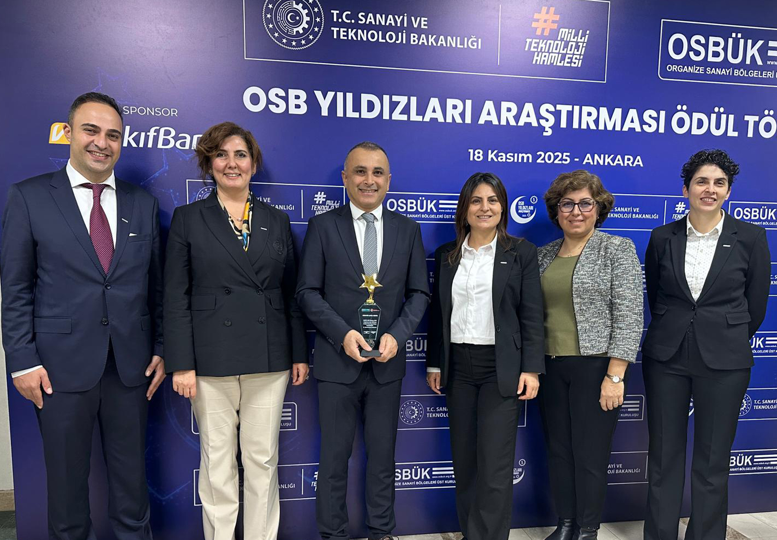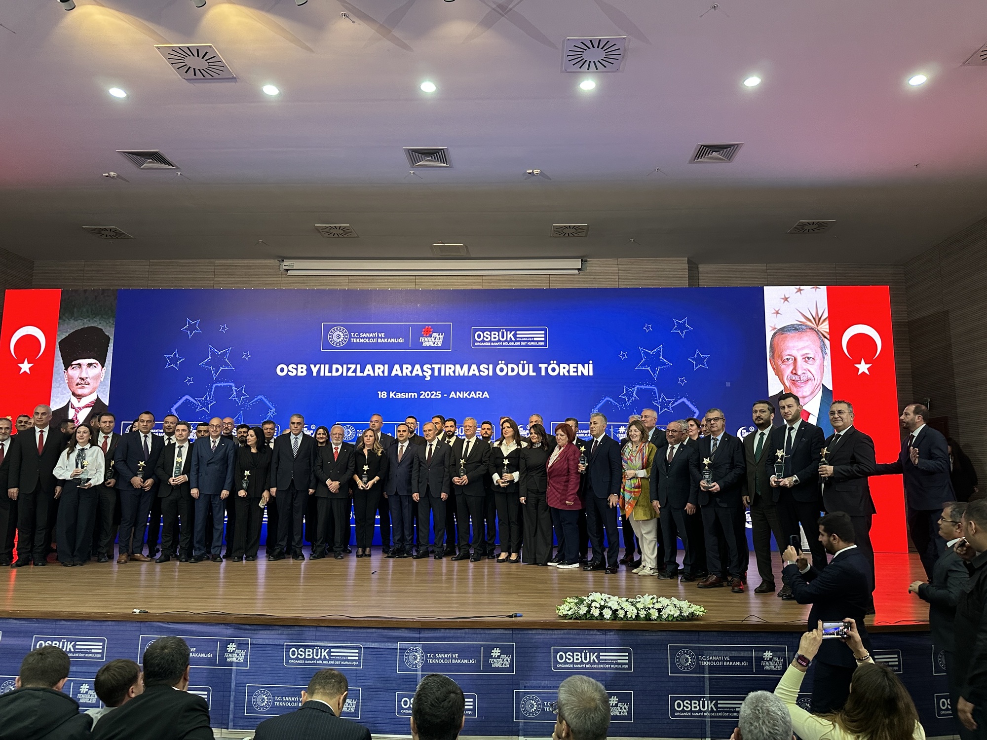 Organize Sanayi Bölgeleri Üst Kuruluşu (OSBÜK) tarafından bu yıl beşincisi düzenlenen OSB Yıldızları Araştırması Ödül Töreni, Sanayi ve Teknoloji Bakanı Sayın Mehmet Fatih Kacır’ın katılımlarıyla gerçekleştirildi.