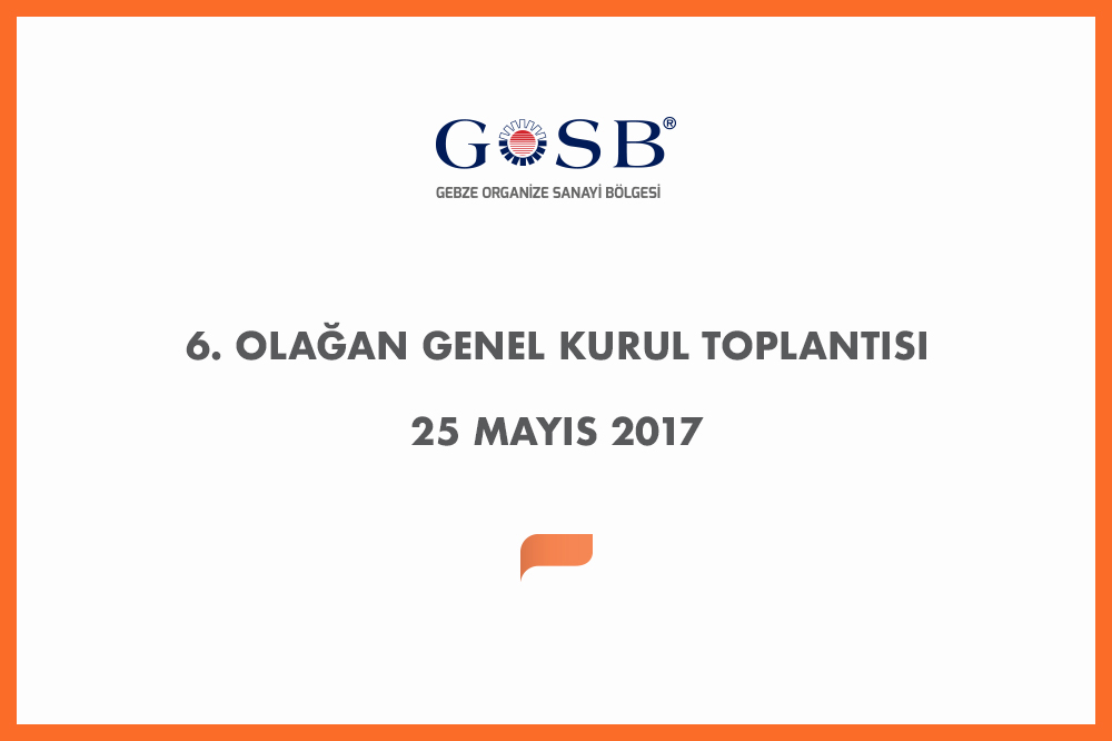 4562 sayılı OSB Kanunu ile OSB Uygulama Yönetmeliği’nin ilgili maddeleri gereğince yapılacak olan GOSB 6. Olağan Genel Kurul Toplantısı, 25 Mayıs 2017 Perşembe günü, GOSB Yönetim Merkezi ve Sosyal Tesisleri Konferans Salonu’nda, saat 14:00’da yapılacaktır.